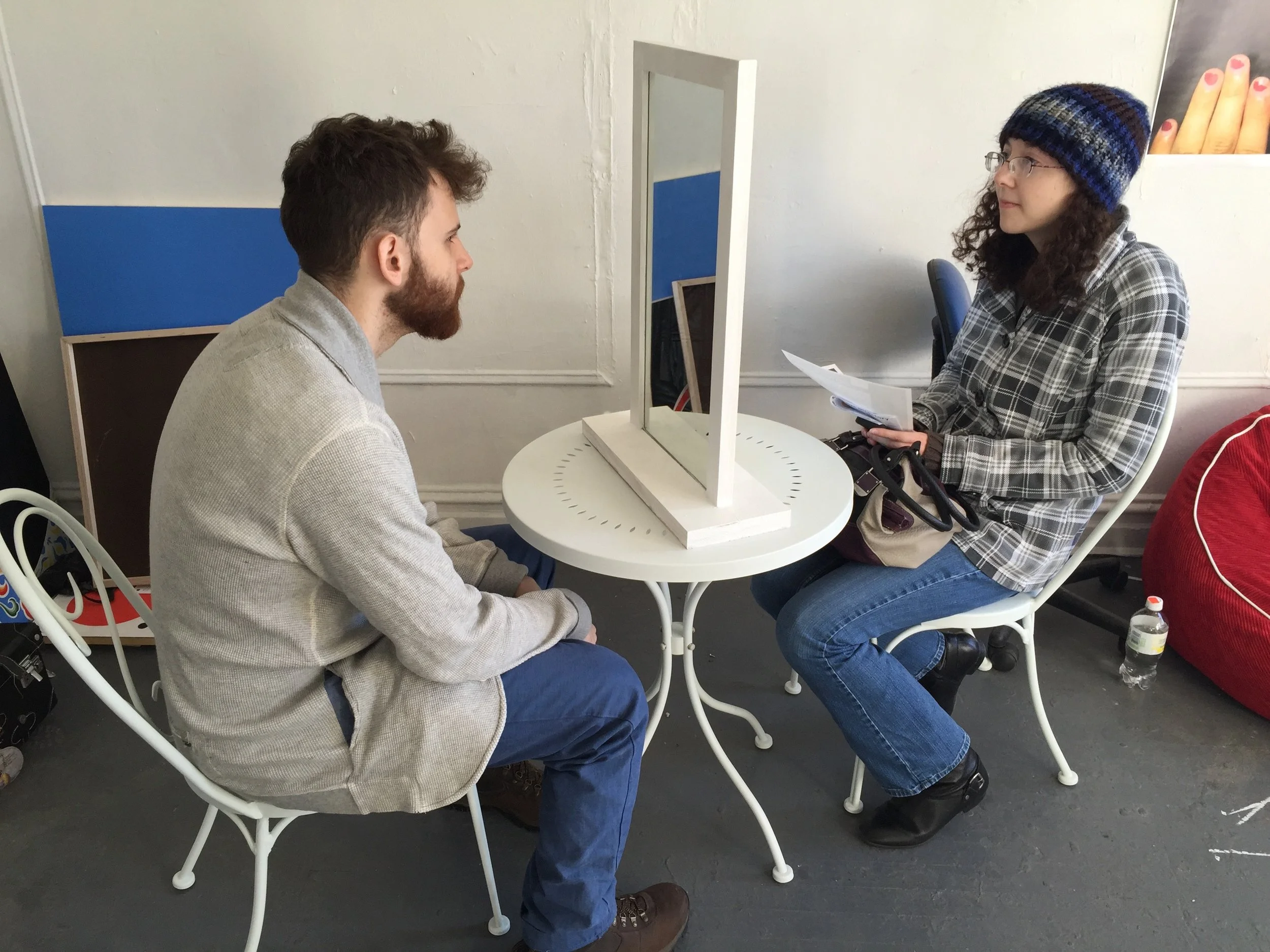 This project discusses self-conscious and self-awareness during a social and interpersonal activity, which is chatting. This installation can place either outdoor or indoor. I used a “patio bistro set”, which come with one chat table and two chairs, and have a double-sided portraits size mirrors fixed on the table. Each side of the mirror faces directly to one chair. Therefore, anyone sit on the chair cannot avoid the mirror and their own face reflection when are talking to the other person. The participants experience a chat with knowing how their own faces look like during the conversation. This setting did interrupt the conversation in different ways, often time the topics of their conversations has been affected and changed to the participants’ own appearances.